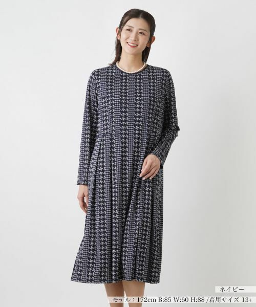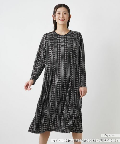 ストライプ状に表現された千鳥格子柄のプリントが秋冬シーズンらしい洗練された雰囲気を漂わせるミディアム丈のワンピース。巧妙なバランスでタック&ギャザーを入れ、程よい立体感のあるシルエットを描き出しています。身体のラインを拾いにくく、ナチュラルに体型カバーできるのも嬉しいポイント。オフィスから週末のおでかけまで、多彩なシーンでフレキシブルに活躍してくれそうなアイテムです。バックファスナーにより着脱が可能。