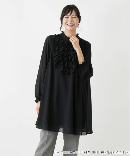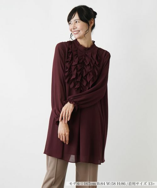 独特のシワ感のある薄手のファブリックで仕上げた、チュニック丈のハイネックブラウス。ネック周りや袖口のフリル、フロントのラッフルフリルが華やかなムードを漂わせます。袖口はゴム仕様で心地よいフィット感をもたせました。身体のラインを拾いにくく、ヒップまで隠れるゆったりとした丈感でナチュラルに体型カバーできるのも嬉しいポイント。バックネックの涙あきはボタン開閉が可能です。