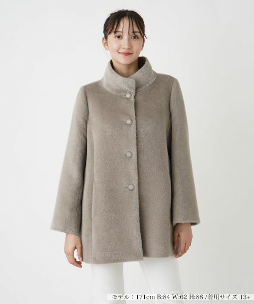 アルパカをブレンドした起毛感のある素材が暖かみを感じさせる、ハーフ丈のスタンドカラーシャギーコート。ふんわりとした生地が優しい風合いで馴染み、高さのある端正なスタンドカラーがデコルテを包み込みます。ヒップが隠れる丈感で、身体のラインを拾いにくいシルエットがナチュラルな体型カバーを叶えるのも嬉しいポイント。カジュアルにもエレガントにも合わせやすく、肌寒さが増す季節にぴったりのアウターです。