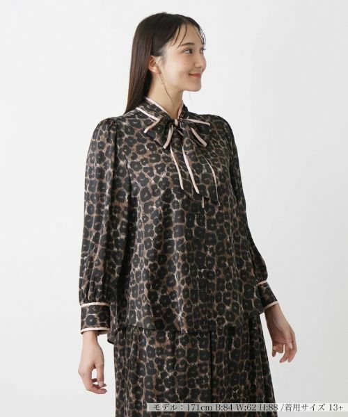 サファリテイストが薫るレオパード柄のボウタイブラウス。襟元で結ばれたボウタイが華やかさを際立たせるエッセンスに。ふんわり膨らむバルーンスリーブやギャザーたっぷりのバックスタイルが優しげなフェミニンムードを演出。ボウタイや袖口の配色が絶妙なアクセントに。派手になりすぎない色合いなので着こなしやすく、オフィスからパーティやセレモニーまで多彩なシーンで活躍してくれそう。お揃いの柄のスカートを合わせたセットアップコーディネートもおすすめです。ボウタイは取り外し不可。
