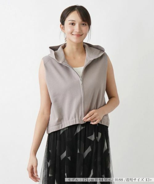 季節を問わず着こなしにアクセントを加えてくれるフーデッドベスト。柔らかな素材で仕立てられているため、ストレスなく快適に着用いただけます。フード付きのデザインがリラックスした印象を与え、軽快に動きやすく、日常の様々なシーンで活躍すること間違いなしのアイテムです。裾はゴム入りで適度なフィット感をもたせました。きれいめのワンピースやシャツと合わせることで、カジュアルで洒脱感のあるレイヤードスタイルにアップデート。さらにジーンズやスカートとの相性も抜群で、幅広いコーディネートが楽しめます。