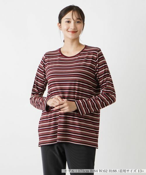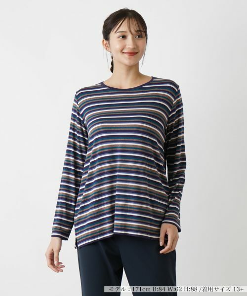 表情豊かなマルチボーダーが彩るクルーネックカットソー。ネックラインは程よく開きをもたせており、絶妙なバランスの抜け感を演出。優しい風合いのレーヨンベースの生地にはストレッチが効いているので肌当たりも快適。すっきりとしたシルエットが身体のラインを美しく整え、一枚でのスタイリングはもちろん、ジャケットやコートのインナーとしても重宝する汎用性の高いアイテムです。