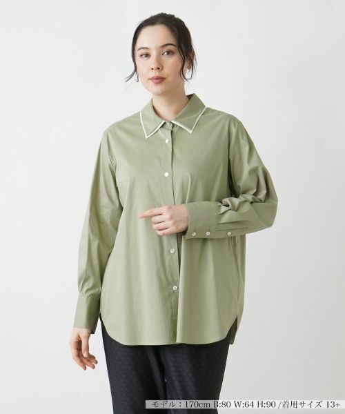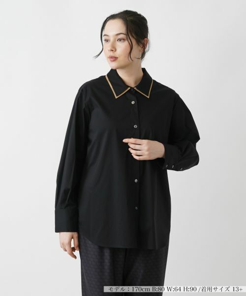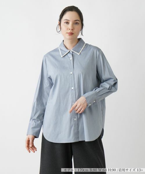 さりげなく配色のアクセントを加えた、形の良いレイヤード風の襟がポイントになったブラウス。袖には程よくボリューム感をもたせ、肩肘張らないリラクシーな着心地を叶えました。コットンにナイロンをブレンドした爽やかな風合いの生地を使い、適度にストレッチを効かせているので着心地も快適。すっきりとしたパンツでまとめるのはもちろん、フェミニンスカートを合わせたキレイめのコーディネートにも好相性のトップスです。