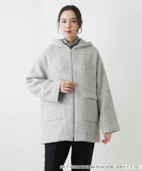 程よく起毛感のある生地を用い、煌めくスパンコールを散りばめたフーデッドジャケット。ドロップショルダーで程よいリラックス感を生み出し、肩肘張らないストレスフリーの着心地を叶えました。フロントはジップアップ仕様でスムーズに着脱が可能です。前ウエスト両サイドにはフラップポケットをレイアウト。バックスタイルは大ぶりのフードがインパクトを放ちアクセントに。やや長めの丈感で細身のパンツともバランスよくコーディネートできます。
