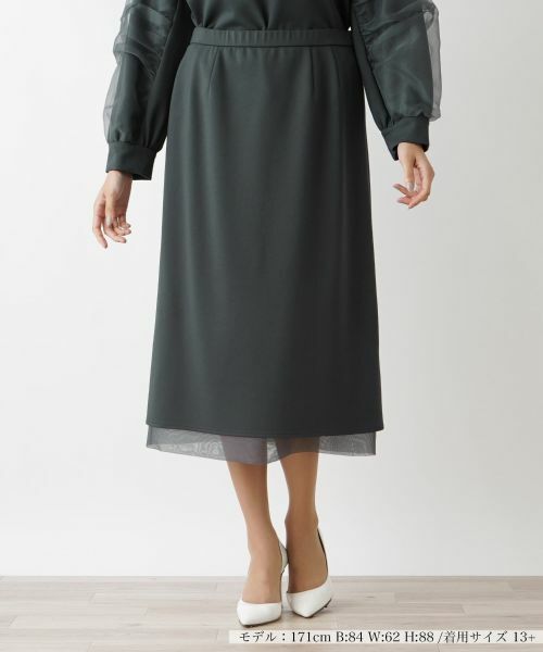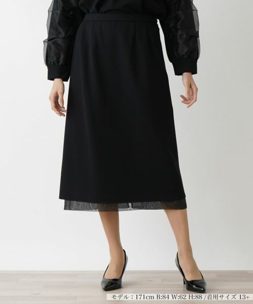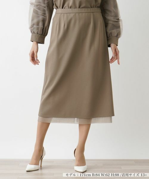 無駄な装飾を省いたベーシックな無地のミモレスカート。ウエスト周りをシェイプしつつ、裾に向かって緩やかに広がりをもたせたシルエットが上品かつフェミニンなムードを漂わせます。ヘムラインから異素材が覗く、レイヤード風のデザインもポイント。後ろ裾にはスリットを入れ、程よい抜け感とスムーズな足捌きを実現しています。サイドホック&ファスナーにより着脱が可能。同素材のブラウスを合わせたセットアップ風コーディネートもおすすめです。