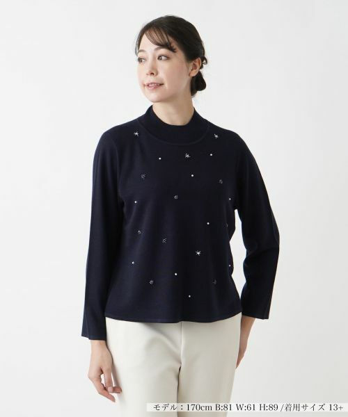 さりげないラメが入った華やかなプルオーバーニット。数種類のパールやビーズの繊細なビジューの輝きを前身頃に施しています。前身頃の裏側にはビジュー刺繍の糸の始末で引っ掛からないようチュール素材を重ねて裏面にもこだわったきれいな仕様にしています。