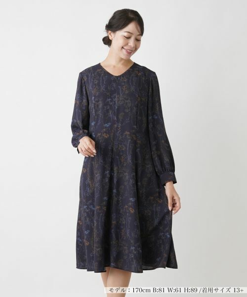 繊細なタッチで表現されたボタニカル柄がさりげなくセンスを引き立てる、ミディ丈のVネックフレアワンピース。すっきりとシャープに開いたネックラインがデコルテをキレイに覗かせ、女性らしい佇まいを演出。ふわりとしたスリーブラインや広がるように仕上げたスカート部分は自然なドレープ感があり、柔らかなシルエットを描き出します。フロントファスナーによりスムーズに着脱が可能。