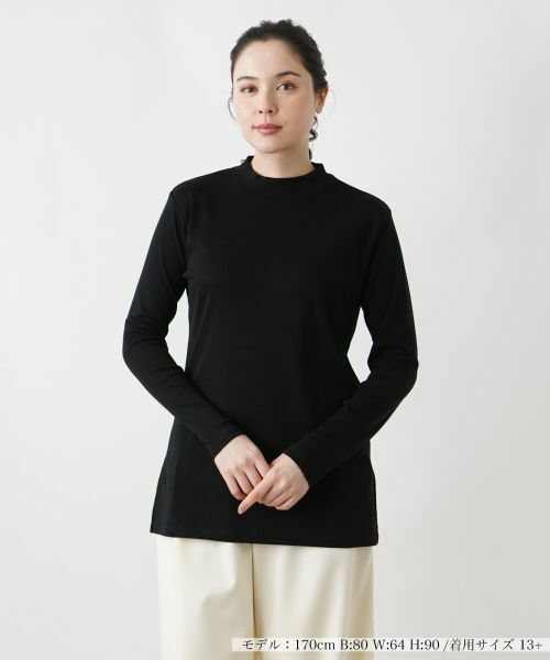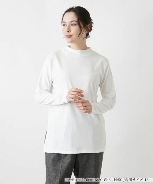心地よくフィットするスマートなシルエットでデザインした、柔らかなコットン仕立てのハイネックカットソー。高さのあるネックラインが気になるデコルテをさりげなくカバー。裾にはサイドスリットを入れ、動きやすさにも配慮しています。ベーシックな無地で合わせやすく、一枚での着こなしはもちろん、インナーとしてジャケットやカーディガンとのレイヤードスタイルでも重宝しそうなアイテムです。