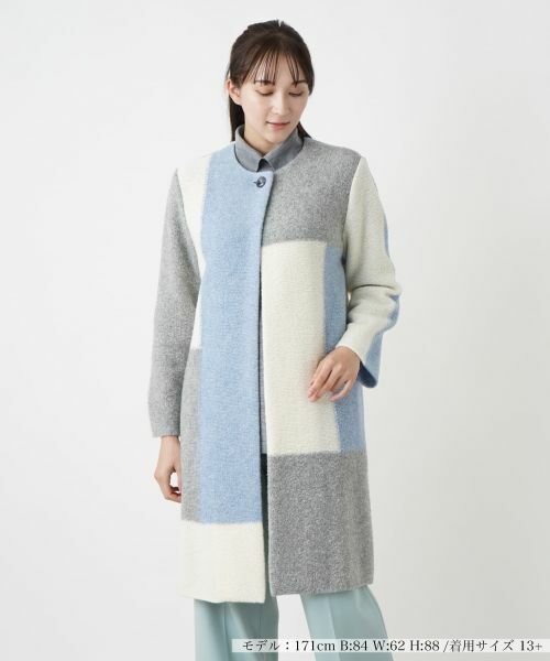 起毛感のあるニット素材で仕立てた、モンドリアン柄を思わせるグラフィカルなカラーブロックデザインのノーカラーコート。フロントは比翼仕立てですっきりとした印象に。身体のラインを拾いにくく、ヒップまで隠れる丈感でナチュラルに体型カバーできるのも嬉しいポイント。前ウエスト左右にはシンプルなスリットポケットをバランスよくレイアウトしています。ひと味違ったインパクトのあるアウタールックに仕上がり、さりげなくセンスを引き立てる一着です。
