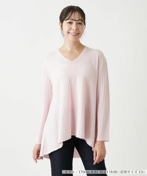 編地を巧妙に切り替えた、やや薄手のリブ編みニットプルオーバー。すっきりと開いたVネックラインがデコルテを覗かせ、程よい抜け感を演出。ドロップショルダーで程よくゆとりをもたせつつ、バックヘムを長めに設定することで、シルエットに変化を生み出しています。ヒップまで隠れる丈感なのでナチュラルに体型カバーできるのも嬉しいポイント。足元は定番のベーシックなパンツでまとめるのはもちろん、フェミニンなスカートとも相性抜群です。