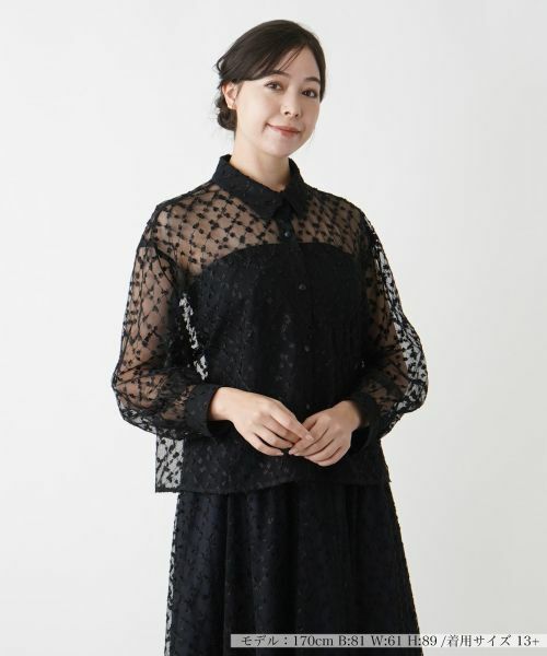 ダイヤモンド状の格子柄がエレガントな雰囲気を纏った、軽やかなチュール素材の襟付きブラウス。ふんわりとしたシルエットがトレンド感を引き立て、ナチュラルなドレープ感が美しく柔らかなニュアンスを与えてくれる一着。上品でありながら、さりげなく華やかさを加えるトップスは、コーディネートに特別なアクセントをプラスしてくれそうです。同素材のスカートと合わせたセットアップスタイルもおすすめです。