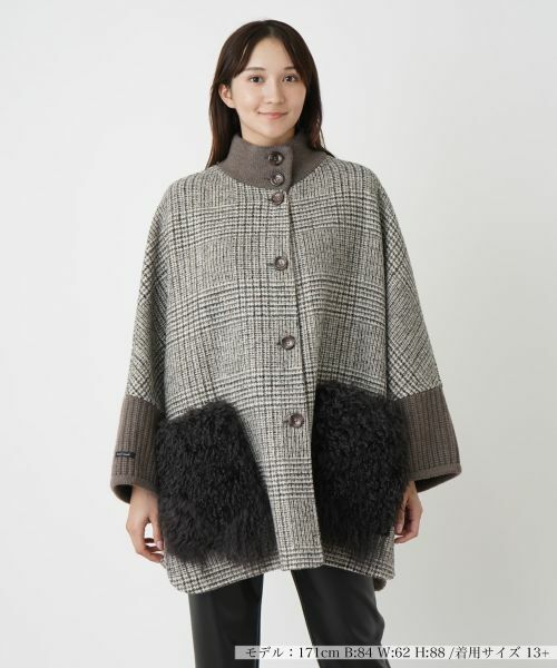 クラシカルな趣のグレンチェックが彩る、ポンチョ風シルエットで仕上げたスタンドカラーコート。襟や袖は部分的にローゲージニットで切り替え、表情に変化を生み出しています。前ポケットにあしらわれたボリューム感たっぷりのファーがラグジュアリーな雰囲気を演出。マーブルボタンを採用し、細部までこだわりが感じられるディテールを落とし込んでいます。身体のラインを拾いにくく、ヒップまで隠れる丈感なので体型カバーにもひと役かってくれそうです。