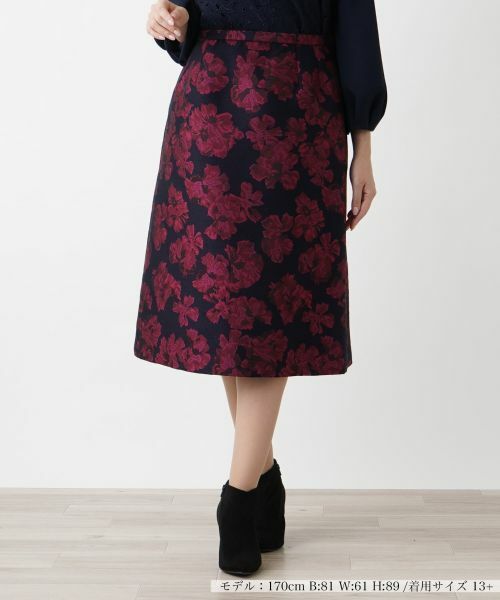 Aラインのシルエットが腰回りをすっきりと見せ、脚を美しく引き立てます。シンプルなトップスと合わせるだけで、洗練されたコーディネートが完成。生地の持つ高級感と立体的な花柄が、女性らしさを際立たせます。