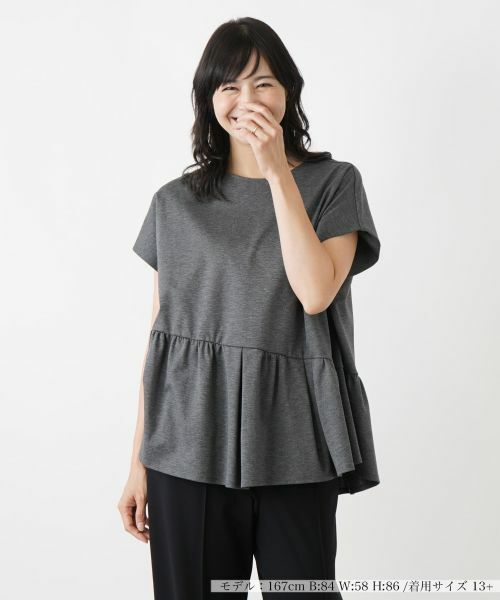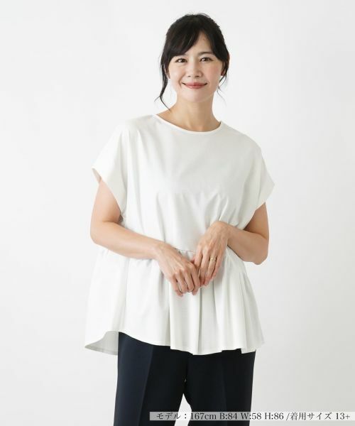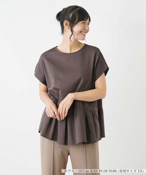 ふわりと広がる裾周りのペプラムが女性らしい華やかさを演出するブラウス。ハイウエストの切り替えをアシンメトリーに仕上げることで、表情にさりげなく変化を生み出しています。肌当たりのよいやや薄手のコットン生地を使い、リラックス感溢れるフレンチスリーブで肩肘張らない軽やかなニュアンスに。落ち着いた色合いでまとめているので気軽にコーディネートに取り入れることができ、ボトムスを選ばずに合わせやすい一枚です。