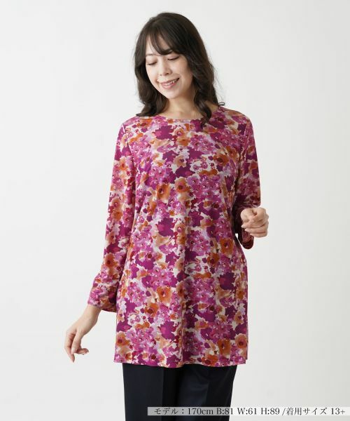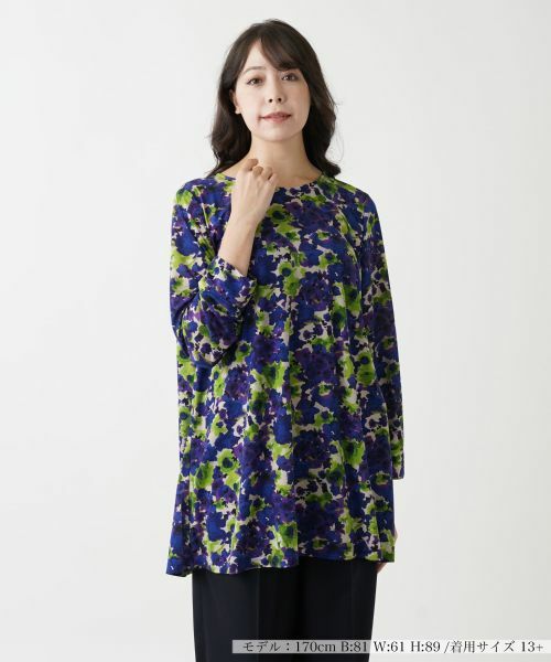 これからの季節にぴったりのアーティスティックなフラワー柄をプリントしたチュニックブラウス。裾周りにふわりと広がりをもたせたフレアシルエットがいっそう華やかさを引き立てます。ネックラインはすっきりと開き、バックネックにボタン留めの涙あきを施すことで絶妙なバランスの抜け感をプラスしました。コーディネートはレギンスやスキニーパンツなどのすっきりとしたボトムスでまとめると好相性。