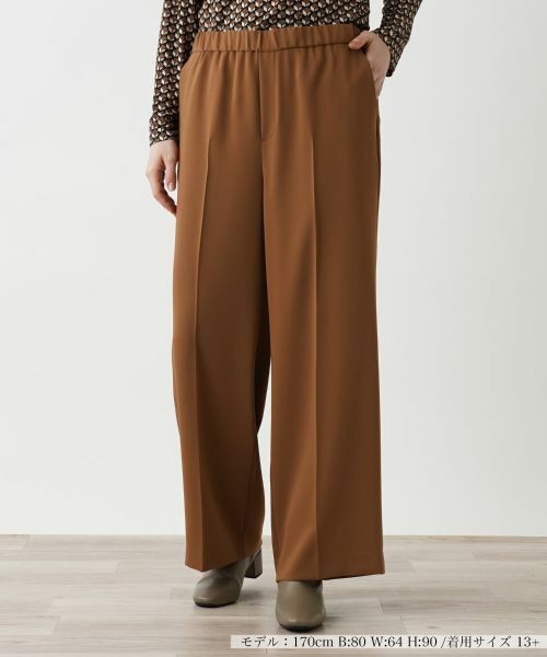 オンオフを問わず多彩なシーンで活躍してくれそうなシンプルな無地のワイドパンツ。股上をやや深めに設定し、程よいリラックス感のあるはき心地を実現しています。レッグラインはゆったりとさせながらも、センタープレスを施すことですっきりとしたストレートシルエットを生み出しています。バックウエストはゴム仕様で心地よくフィット。肌当たりのよいやや薄手の生地を使い、快適なはき心地を叶えました。