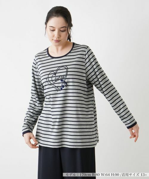シンプルな等間隔のボーダーを背景に、ユニークなハート&ロゴのプリントをあしらったロングスリーブカットソー。絶妙なバランスで開いたネックラインが程よい抜け感を演出。すっきりとしたシルエットで着こなしやすく、ミモレスカートやワイドパンツとも好相性でボトムスを選ばず気軽にコーディネートしやすい一枚。肌当たりのよいコットンブレンドの柔らかな生地を使用しているので快適な着心地を実感できます。
