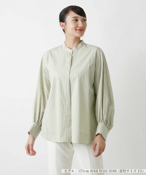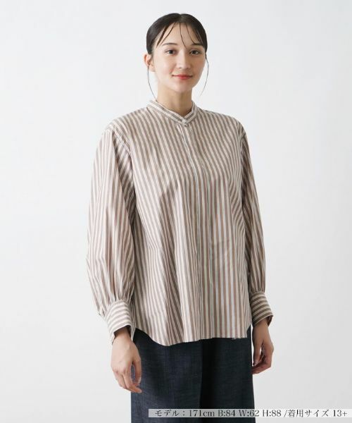 レトロテイストのストライプ柄が爽やかなバンドカラーブラウス。ドロップショルダーとボリュームスリーブで仕上げ、バックタックを施すことで程よいリラックス感を作り出しています。フロントボタンを隠した比翼仕立てですっきりとした印象に。さらにヘムラインは前後差をもたせ、シルエットにさりげなく変化を生み出しています。さらりとした風合いのコットン生地を使い、爽やかな着心地を叶えました。パンツにもスカートにも合わせやすく、着回し力に優れた一枚です。