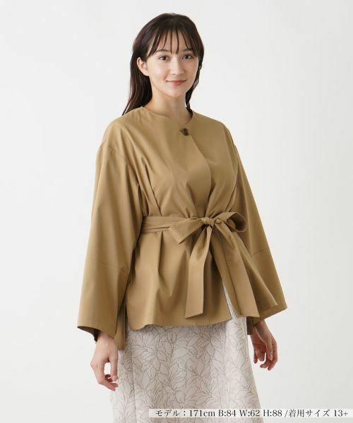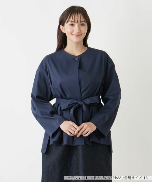 前開き部分はボタン留めで、トップには一つのボタンがあり、控えめなデザインのコートです。ウエスト部分には共布のリボンベルトがあり、シルエットを調整できるデザインです。このベルトは、リボン結びにすることで女性らしい柔らかさを演出できます。首元はスタンドカラーに近いデザインで、すっきりとした印象を与えます。