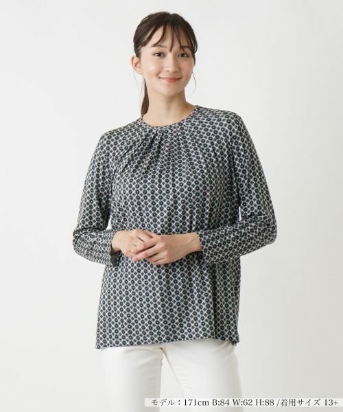 首元には、ギャザー(細かいひだ)が入っており、全体に柔らかなドレープ感を与えています。クルーネックで、シンプルながらも上品な印象を持つデザインです。長袖で、比較的フィット感のあるシルエットに見えますが、ゆったりとした快適さも感じられるスタイルです。