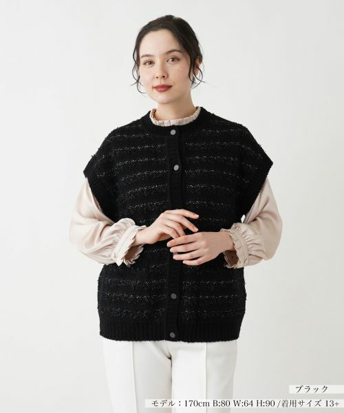 表情豊かなニットツイード素材で仕立てられた、ざっくりとした風合いのベスト。程よいボリューム感のあるショルダーラインが、気になる二の腕周りをさりげなくカバーし、バランスの取れたシルエットを実現します。お手持ちのニットやカットソーとレイヤードすることで、季節感を感じさせる新鮮なコーディネートに。立体感のある素材がスタイルに奥行きを与え、カジュアルにもきれいめにも合わせやすい一着です。