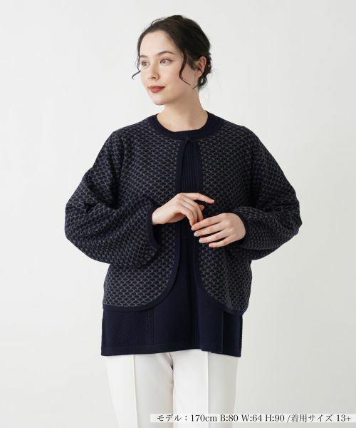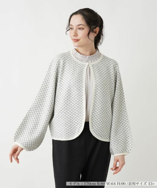 オプティカルな模様が視線を集める、ボレロ風デザインのカーディガン。ゆったりとしたボリュームスリーブが、動きやすさとリラクシーなムードを引き出し、ラウンドヘムが柔らかなニュアンスをプラス。首元はホック留め仕様で、すっきりとした印象をキープしつつ簡単に着脱可能。ロングワンピースに重ねることで、上級者らしいレイヤードスタイルが完成し、カジュアルからエレガントなシーンまで幅広く活躍する一枚です。