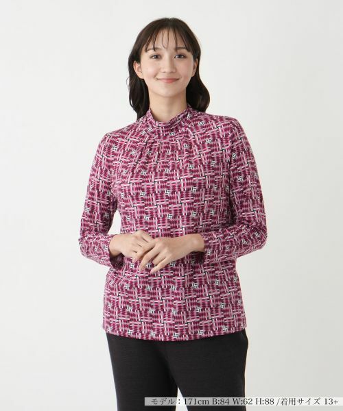 グラフィカルな幾何学柄が目を惹くハイネックカットソー。モダンなデザインが、コーディネートに洗練されたアクセントを加えます。首元を優しく包み込むネックラインは、顔周りをすっきりと見せると同時に、程よい上品さも兼ね備えています。全体的にシャープなシルエットが、スマートかつスタイリッシュな着こなしを演出。ジャケットやカーディガン、アウターのインナーに合わせれば、柄がさりげなく映え、コーディネートに深みをプラスします。