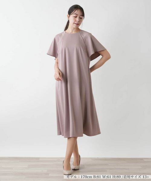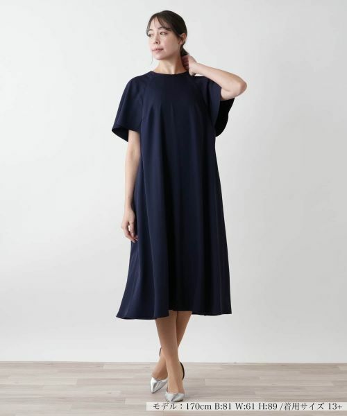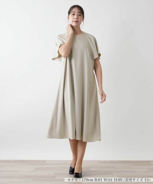 微細な光沢感をまとったやや薄手の生地で仕立てられた、膝上丈のフレアワンピース。袖や身頃には広がりを持たせており、動きに合わせてふわりと揺れるフレアシルエットが、リラクシーでありながらも洗練された雰囲気を演出。肩ラインはラグランカットでストレスフリーな着心地を実現しました。絶妙な丈感が足元を美しく見せ、ヒールからフラットシューズまで多彩なフットウェアと相性の良さを発揮します。バックにはファスナーが施されており、スムーズに開閉が可能。