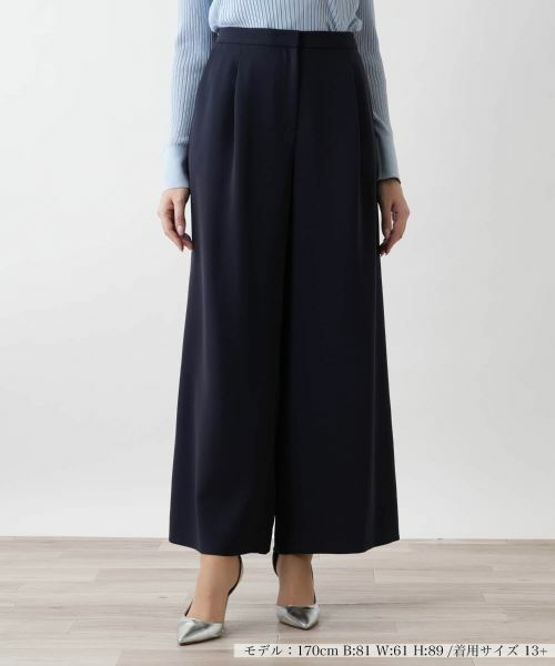 大胆に広がるラインが動きに合わせて美しいドレープを生み出す、存在感溢れるシルエットのフレアパンツ。ウエストは程よくシェイプされており、腰回りをすっきりと見せつつ、レッグラインはリラックス感をもたせているため、快適さと洗練されたデザイン性を兼ね備えています。ウエスト部分には適度な伸縮性があり、体型に優しくフィット。長時間の着用でもストレスフリーなはき心地を実現します。トップスをタックインすることで脚長効果を強調し、スタイルアップを叶えてくれる一本です。