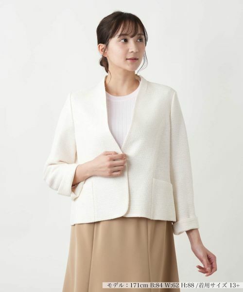 巧妙なパターンメイクが光る、洗練されたシルエットのノーカラージャケット。コットン、レーヨン、ナイロンをブレンドした軽やかな風合いの生地を使用しており、さらりと羽織るだけでスタイリッシュな雰囲気をまとえます。シャープなVネックが首元をすっきりと見せ、様々なインナーともバランスよくマッチ。シャツやブラウスを合わせてきちんと感のあるスタイルに仕上げたり、カットソーやタートルネックと合わせてカジュアルダウンしたりと、幅広いコーディネートに対応します。スリット入りの袖口は折り返しが可能。