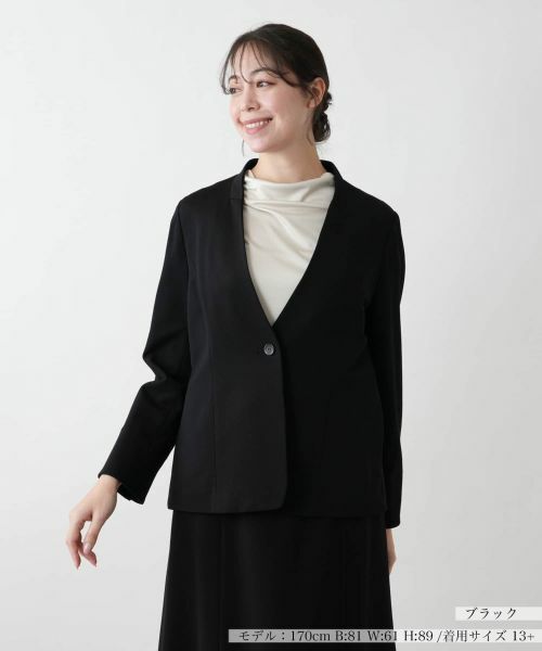 シックな色合いで仕立てられたノーカラージャケット。レーヨンとナイロンをブレンドした生地を使用し、しなやかな質感と程よいストレッチ性を備えています。無駄を削ぎ落としたミニマルなデザインが、スタイリッシュな印象を与え、様々なコーディネートに自然と馴染む一着。シャープにカットされたVックラインが顔周りをすっきりと見せ、絶妙な抜け感を演出。程よいリラックス感にエレガンスが絶妙に融合したデザインで、大人の女性らしい上品かつハンサムな着こなしを楽しむことができます。------------------------------------着用シーズン:初夏伸縮性:身頃あり、スリーブなし透け感:なしポケット:あり生地の厚さ:やや薄手裏地:あり-------------------------------------※商品の色味は、撮影場所や光のあたり具合、お客様のお使いの機器により色味が違って見える場合がございます。予めご了承ください。家庭洗濯不可漂白不可タンブル乾燥不可アイロン低温160℃まで石油系溶剤ドライクリーニング弱ウェットクリーニング不可