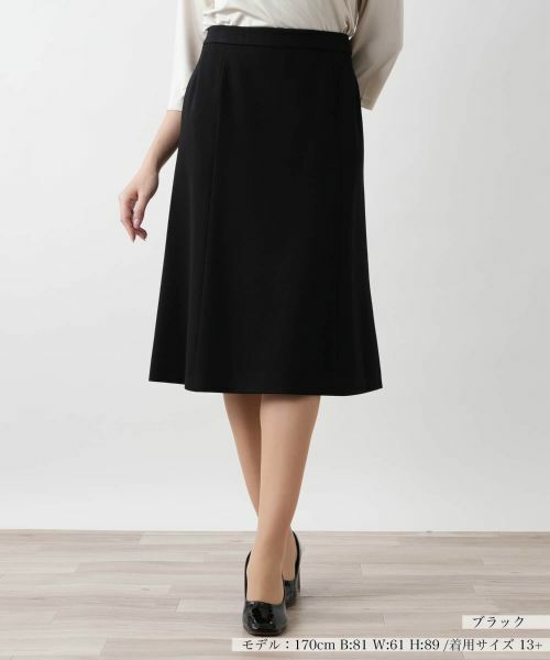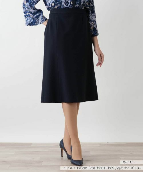 レーヨン?ナイロンのブレンド生地を使用した、シックな色合いのミディアム丈スカート。しなやかな質感と程よいストレッチ性を備えています。ウエスト周りには伸縮性をもたせており、心地よくフィットしながらストレスフリーのはき心地を実現しています。緩やかに広がる美しいシルエットが、レッグラインをきれいに見せるとともに、上品な中にもリラクシーな印象を演出。洗練された大人の雰囲気を漂わせるデザインでさりげないエレガンスをプラスします。フロントは右側のみポケットをレイアウト。サイドホック&ファスナーにより開閉が可能。