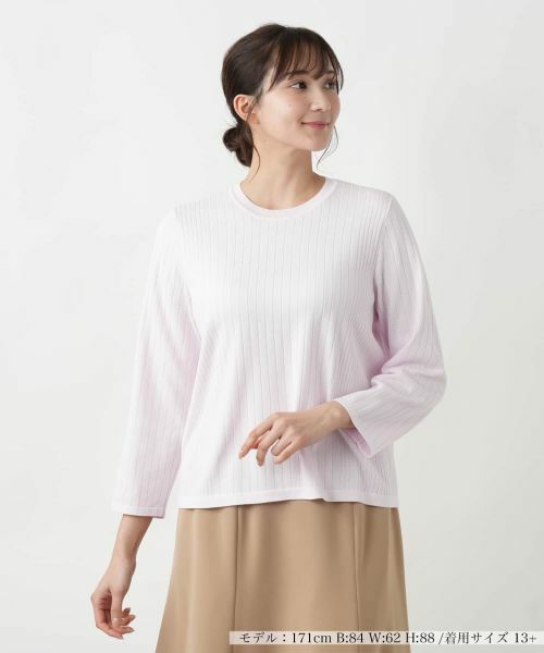 ストライプ状の編み柄がさりげなくデザインされたクルーネックニットプルオーバー。ネックラインは浅めに設定されており、首元をすっきりと見せながらも、落ち着きのある上品なニュアンスを演出。心地よく寄り添うような適度なフィット感で快適な着心地を実現しました。ボトムスとバランスよく合わせられ、デニムでラフに仕上げたり、フレアスカートでフェミニンにアレンジするなど、幅広いスタイリングが楽しめる一枚です。