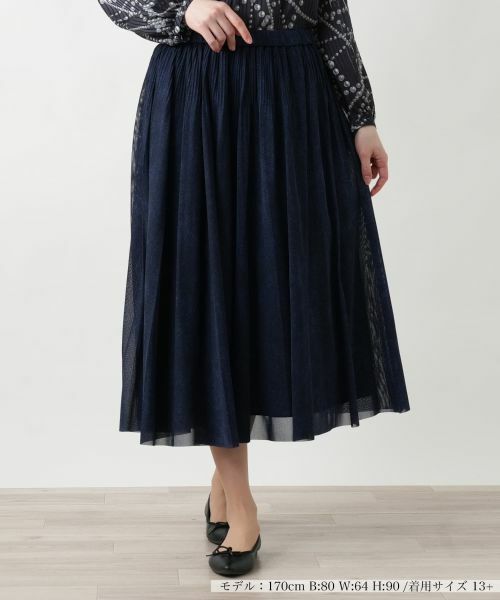 ウォッシュ感のある独特な風合いをプリントで表現したフレアスカート。ヴィンテージのような味わい深いテクスチャーが、シンプルなコーディネートにも奥行きを与え、こなれた印象に仕上げます。ウエストは総ゴム仕様で、締め付け感がなく心地よくフィット。長時間の着用でもストレスを感じにくく、快適な着心地を実現しました。流れるようなプリーツが美しく揺らめき、優雅なAラインシルエットを演出。カジュアルなトップスでラフに着こなすのはもちろん、ブラウスやジャケットでまとめたきれいめなスタイルにもマッチします。