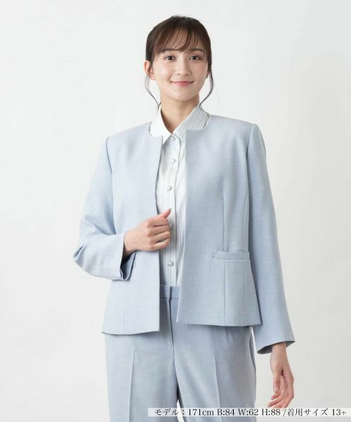 洗練されたパターンメイクが光る、ノーカラージャケット。無駄を削ぎ落としたシンプルなデザインながら、計算されたカッティングと美しいフォルムが特徴。フロントはホック留め仕様で、すっきりとしたミニマルな佇まいを実現します。かっちりとした端正なフォルムが、大人の上品さときちんと感を演出。スリット入りの袖口は折り返してのアレンジも可能。コーディネート全体を格上げしてくれる存在感があり、パンツやタイトスカートを合わせてハンサムなオフィススタイルに仕上げるのはもちろん、ロングスカートやワンピースと合わせてミックス感のあるコーディネートに仕上げるのもおすすめです。