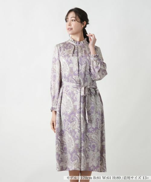 オリエンタル調のペイズリー柄が印象的なワンピース。襟元や袖口には繊細なフリルがあしらわれており、一枚で華やかさと個性を演出するデザインが、日常からエレガントなシーンまで幅広く活躍してくれるアイテムです。ハイウエストで共布ベルトをマークすれば、メリハリの効いた女性らしいシルエットが完成。ウエストをキュッと引き締め、ふんわりと広がるフレアラインが、自然にスタイルアップ効果をもたらします。ベルトを外してリラックス感のある着こなしを楽しむこともでき、気分やシーンに応じたアレンジが可能です。