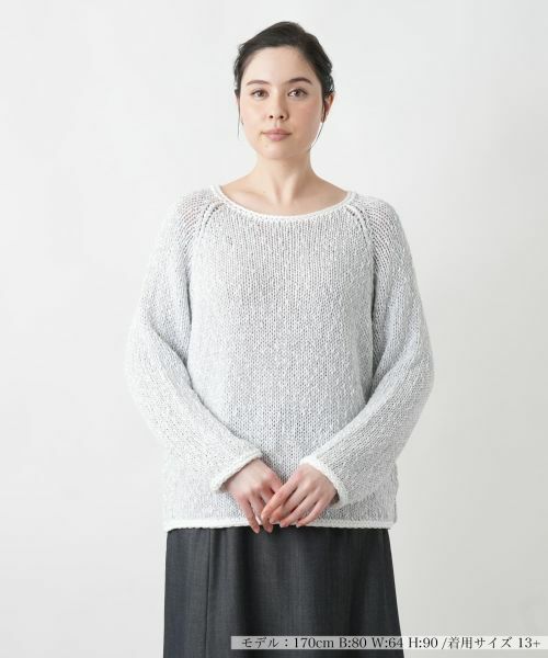 ローゲージで編み込んだ霜降り調の風合いのクルーネックニット。ラグランスリーブを採用し、肩周りにゆとりをもたせることで、抜け感のあるリラックスした着心地を叶えました。程よく開いたネックラインが顔周りをすっきりと見せ、ヘルシーで女性らしい印象を演出。襟元や袖口、裾には配色のトリミングを施し、シンプルな中にもさりげないコントラストを効かせたアクセントをプラス。デニムやワイドパンツと合わせたカジュアルなスタイリングはもちろん、スカートと合わせれば品よくフェミニンな着こなしにもマッチ。