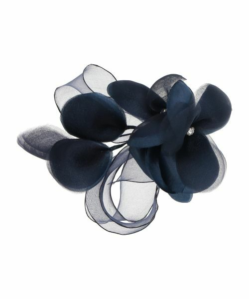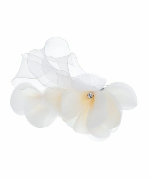 繊細なオーガンジー素材で仕立てたフラワーモチーフのコサージュ。柔らかな質感が特徴のオーガンジーが、ふんわりとした立体感を演出し、優美な雰囲気を醸し出します。控えめながらも上品な輝きを放つビジューがあしらわれ、さりげない華やかさをプラス。結婚式やパーティーなどの特別なシーンにぴったりのアクセサリーで、定番のドレススタイルに添えるだけで一気に華やかな印象へと引き立てます。