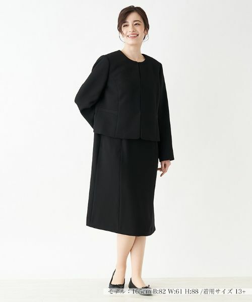 ベーシックなデザインで、フォーマルなシーンに最適なノーカラージャケットと、美シルエットケープ風ミディアム丈ワンピースの2WAYスーツです。シャリ感のある肌触りの良い素材を使用、インナーやアウターで調整をすれば、一年を通してご着用いただけます。
