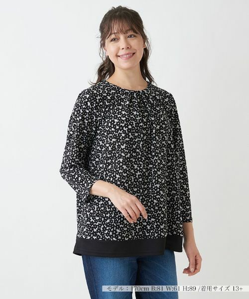 細やかなフラワー模様をシックなカラーリングで描き、大人にもマッチする甘さ控えめなデザインに仕上げたプルオーバーブラウス。ヘムの配色切り替えがのっぺり感を防ぐポイントに。別売りのスカートと合わせて、セットアップとしても楽しめる1品。