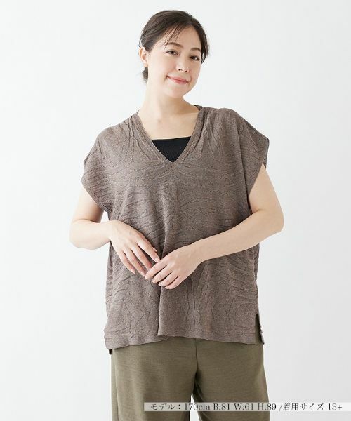 さりげなく浮かび上がる模様とキラリと輝くラメがエキゾチックにマッチした、フレンチスリーブのVネックニットプルオーバー。ゆったりとしたワイドなシルエットだから、こなれた雰囲気も満載。リゾートにもオススメの1品です。※定価(税込)は、2022年06月29日のセール開始前の店舗における販売価格です。家庭洗濯不可漂白不可タンブル乾燥不可アイロン低温160℃まで石油系溶剤ドライクリーニング弱ウェットクリーニング不可