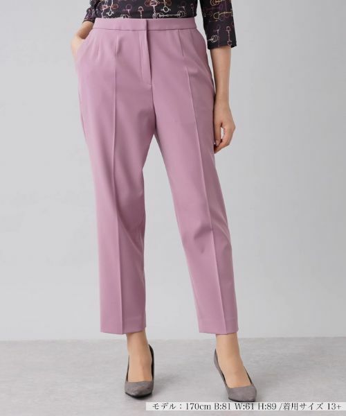 キレイめのカジュアルはもちろん、オフィスなどのかっちりとしたスタイリングにも取り入れたい、シルエットのきれいなテーパードパンツ。股上を深めに設定しているので程よいリラックス感があり、穿き心地も快適。腰高の印象で穿けるので脚長見せ効果も狙えそうです。