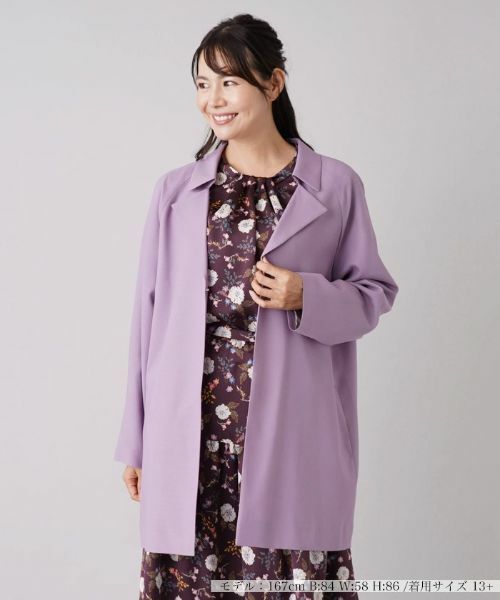 さらりと軽やかに羽織れるロングジャケット。袖はラグランカットで肩肘張らないリラクシーな着心地を叶えました。ヒップが隠れる程度のレングスで体型カバーにもひと役買ってくれそうです。フロントはフック留めで仕上げ、すっきりとした印象に。お手持ちのカットソーやTシャツ、ブラウスとレイヤードするだけでワンランク上の洒脱な着こなしが楽しめます。