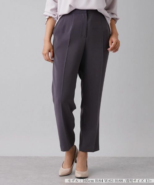 汎用性の高いベーシックなデザインのテーパードパンツ。トリアセテート混の膨らみ感のある二重織素材を使用しているため、適度なハリ感があります。シワになりにくい点も嬉しいポイント。同素材のジャケットとのセットアップコーディネートもオススメです。