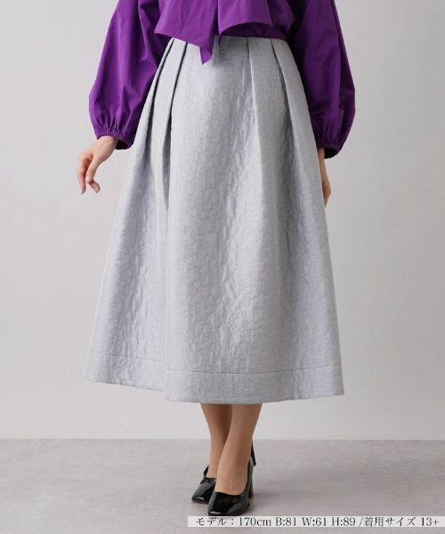 程よい厚みと表面感のあるエンボス風の生地を使用した、ロング丈のフレアスカート。ワイドなタックを配した立体感のある美しいシルエットでボディラインを拾いにくくなっています。適度にウエストシェイプしているから、トップスインも綺麗に仕上がりそうです。ウエスト両サイドにはシンプルなポケットをバランスよくレイアウトしました。バックファスナー付き。