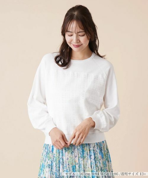 前身頃を透け感のあるレース生地で切り替えた、技ありデザインのニットプルオーバー。ネックラインをやや浅めに設定し、上品かつ落ち着いたニュアンスに。袖はラグランスリーブで肩肘張らないリラクシーな着心地を叶えました。パンツにもスカートにも気軽に合わせやすく、コーディネート力の高いトップスとなっています。
