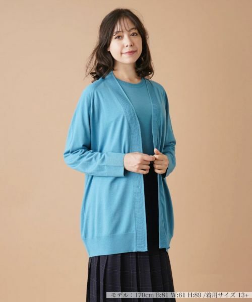 ネックからフロントにかけての編地切り替えが表情にアクセントを加える、ロングレングスのトッパーカーディガン。フロントはノーボタン仕様ですっきりとした印象に。上質なハイゲージニットの優しい肌触りが感じられるトップスです。ヒップまで隠れる程度のセミロング丈なのでさりげなく体型カバーもしてくれます。お手持ちのカットソーやブラウスの上から羽織るだけでこなれ感のあるスタイルが楽しめます。