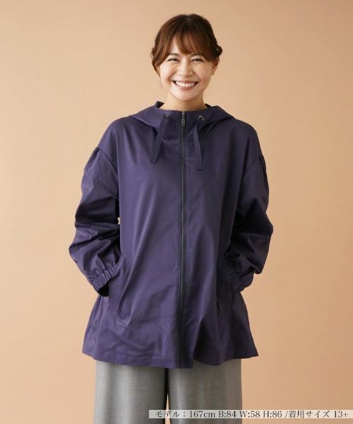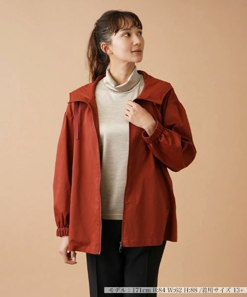 微細な光沢を放つやや薄手の生地を使用した、ビッグフード付きのジップジャケット。生地には撥水加工を施し伸縮性をもたせているので、ちょっとした雨や雪でも気にせずに着用でき、アクティブな動作にも対応。袖口はゴム仕様とし、心地よいフィット感をもたせました。ヒップまで隠れるレングスで、バックヘムは少しフレアに切り替え、女性らしいシルエットに。秋らしいシックなワントーンカラーだから、きれいめのコーディネートにも合わせやすくなっています。