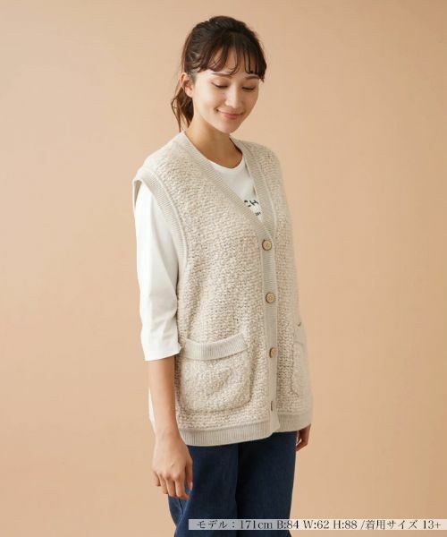 温かみのあるポコポコとした表面感のブークレニットがシーズンムードを醸し出す、Vネックニットベスト。程よくゆとりをもたせたシルエットだから、中に厚手のアイテムを差し込んでもOK。マットなテイストのボタンがさりげないアクセントに。左右のウエストにはシンプルなスクエアポケットをレイアウトしています。季節の変わり目のちょっとしたアウターとしても活躍してくれそうです。
