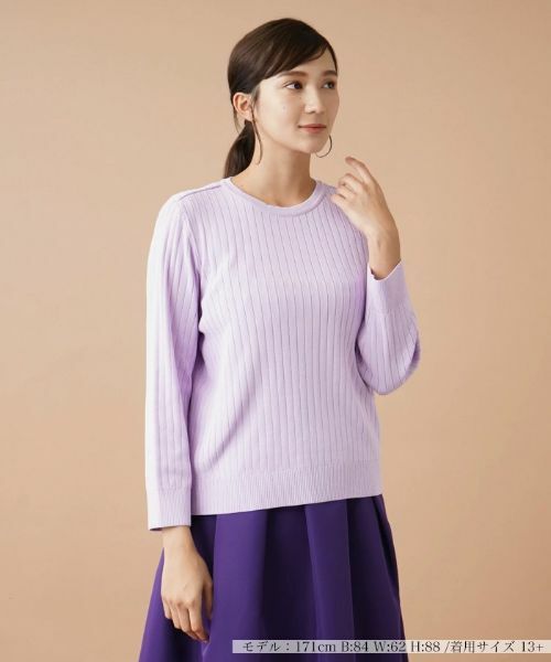 レーヨン混のやさしい風合いの生地で仕立てたクルーネックプルオーバー。等間隔のリブが縦ラインを強調し、すっきりとした佇まいを作り出しています。ネックラインは浅めに設定し、上品で落ち着いたニュアンスに。ミニマルなデザインでコーディネートしやすく、ジャケットやコートのインナーとしてはもちろん、一枚着としても活躍してくれそうなアイテムです。